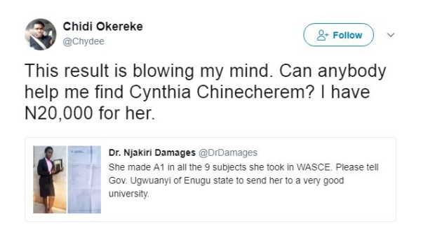 Nigerians On Twitter To Give N525k To Cynthia Chinecherem Who Made 9A1 In WAEC