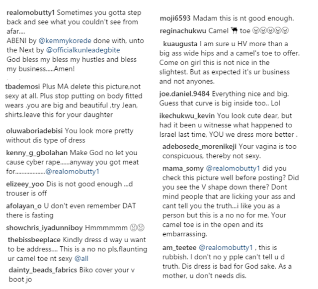 Actress Biodun Okeowo known as Omobutty has come under fire from fans for posting this photo which visibly shows her camel toe.